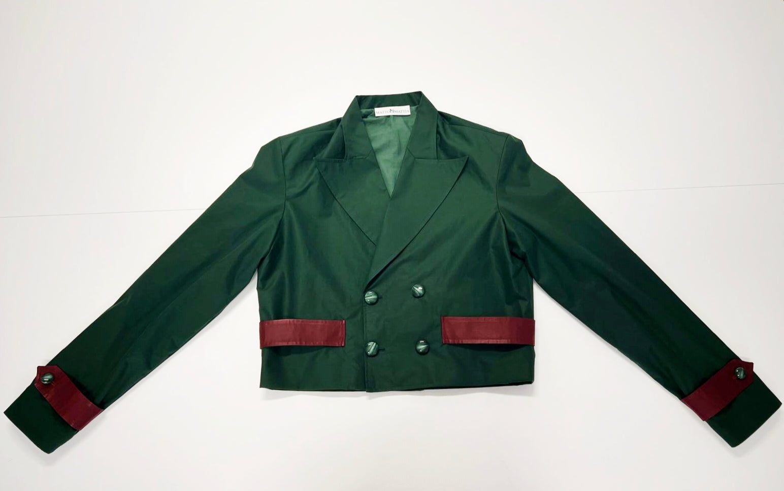 Giacca doppiopetto dal taglio crop e vestibilità over, con revers a lancia strutturato e spalle definite.
